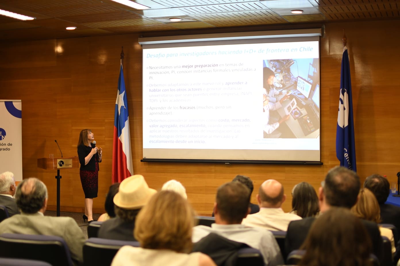La jornada incluyó la conferencia magistral de Dora Altbir Drullinsky, Premio Nacional de Ciencias Exactas 2019, quien abordó los desafíos de la propiedad intelectual y la innovación científica. “Chile publica ciencia por sobre lo que le correspondería según su población, pero patenta mucho menos de lo que podría. Si no logramos transformar conocimiento en innovación y productos, será muy difícil avanzar hacia el desarrollo”, advirtió, subrayando la importancia de fortalecer los sistemas de protección y transferencia tecnológica.